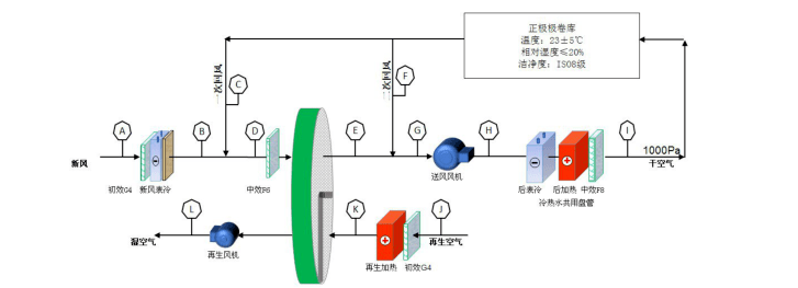 2)低濕需求空調(diào)房間,如正極輥壓間、正極分條間、正極模切間以及正極二分間等房間,其濕度控制需求為≤20%,以及正極涂布間、負(fù)極輥壓間、負(fù)極分條間、負(fù)極模切間以及負(fù)極二分間等房間,其濕度控制需求為≤45%,該需求通過冷卻除濕很難實(shí)現(xiàn),因此往往通過轉(zhuǎn)輪除濕機(jī)組處理后來(lái)滿足使用需求,機(jī)組中設(shè)置一級(jí)轉(zhuǎn)輪。