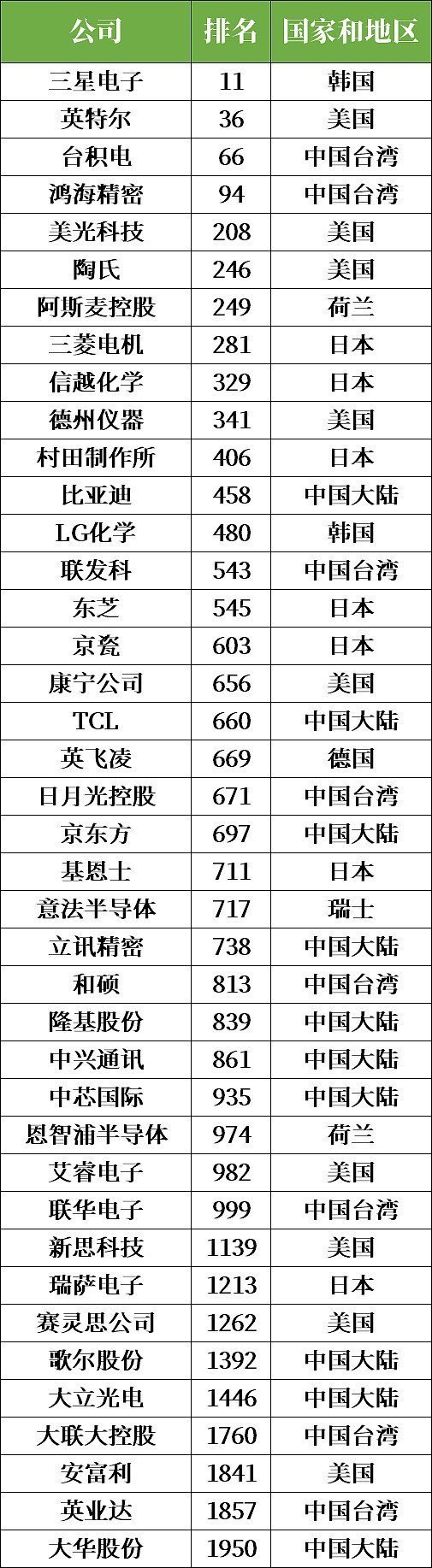 據(jù)統(tǒng)計(jì),2000強(qiáng)榜單中有41家半導(dǎo)體相關(guān)公司,其中包括中國(guó)大陸企業(yè)10家,中國(guó)臺(tái)灣企業(yè)9家