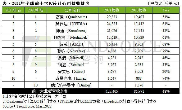 據(jù)TrendForce集邦咨詢研究顯示,2021年由于各類(lèi)終端應(yīng)用需求強(qiáng)勁,導(dǎo)致晶圓缺貨全球IC產(chǎn)業(yè)嚴(yán)重供不應(yīng)求,連帶使芯片價(jià)格上漲,拉抬2021年全球前十大IC設(shè)計(jì)業(yè)者營(yíng)收至1,274億美元,年增48%